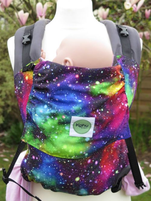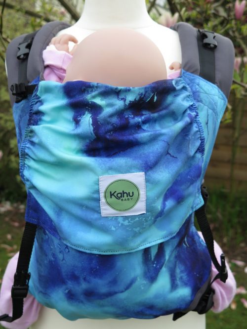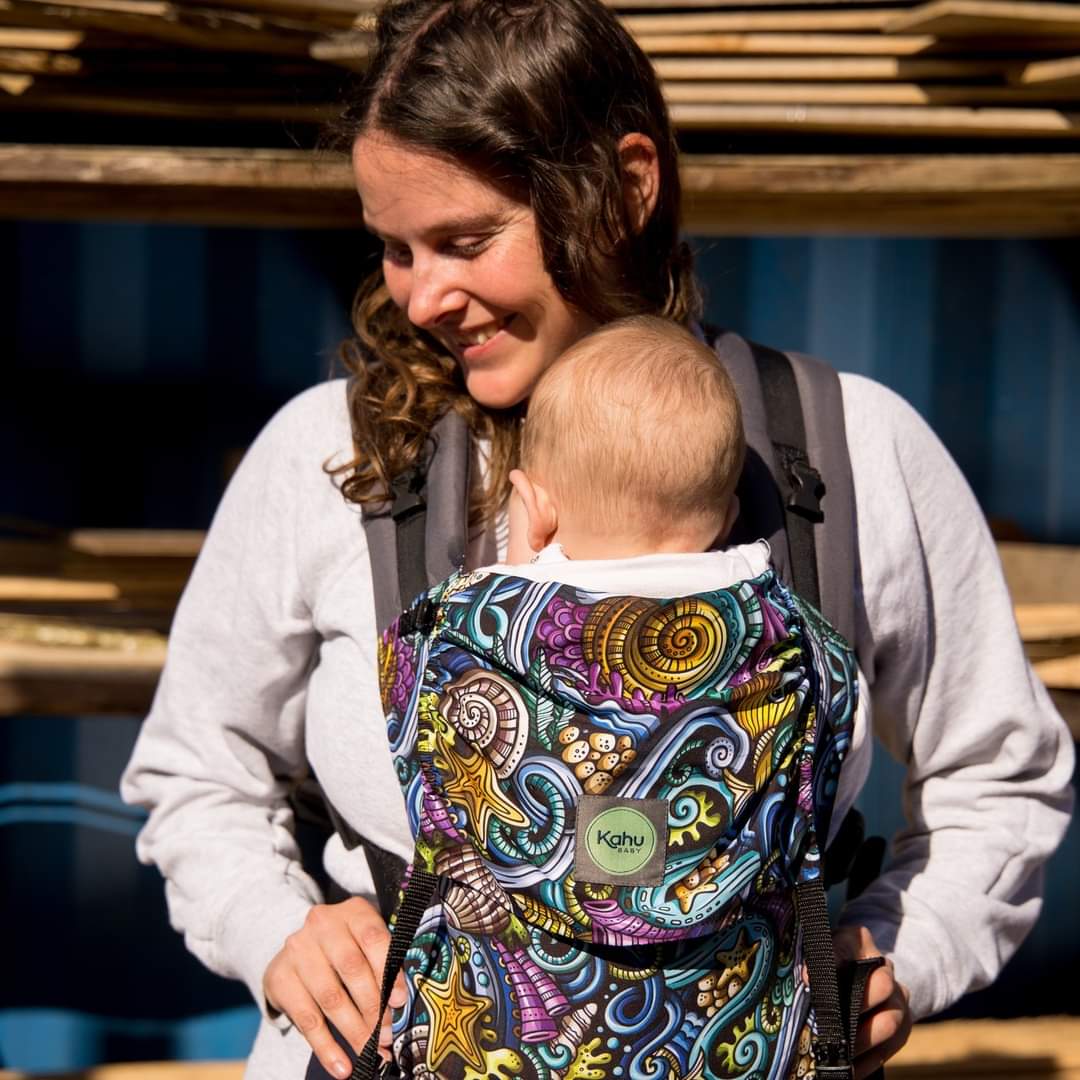 The KāhuBaby Sunshine Carrier has padded shoulder straps that are comfortable without being bulky and can be worn crossed or in rucksack style with dual direction tightening. The baby carrier fits closely to your body, and distributes baby’s weight brilliantly around your body rather than putting lots of strain on one area of your shoulders or back. The non padded flexible waistband gives a close comfortable fit. Goes on in 3 easy clicks.